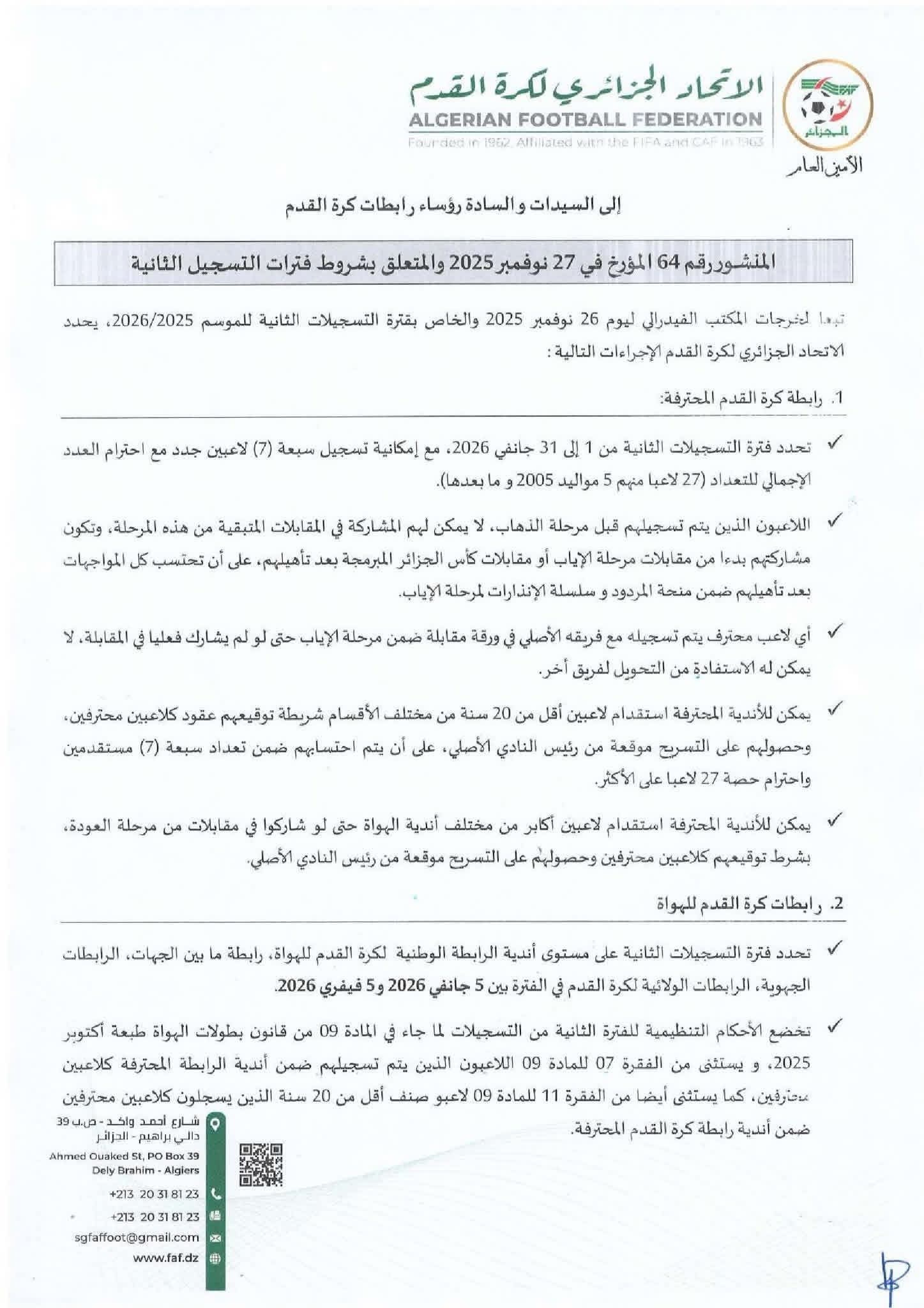 يحدد الاتحاد الجزائري لكرة القدم فترة التسجيل الثانية، مع حق استقدام لاعبين محترفين مرفقين بوثيقة فسخ العقد، لاعبين هواة مرفقين بوثيقة التسريح أو لاعبين بطالين