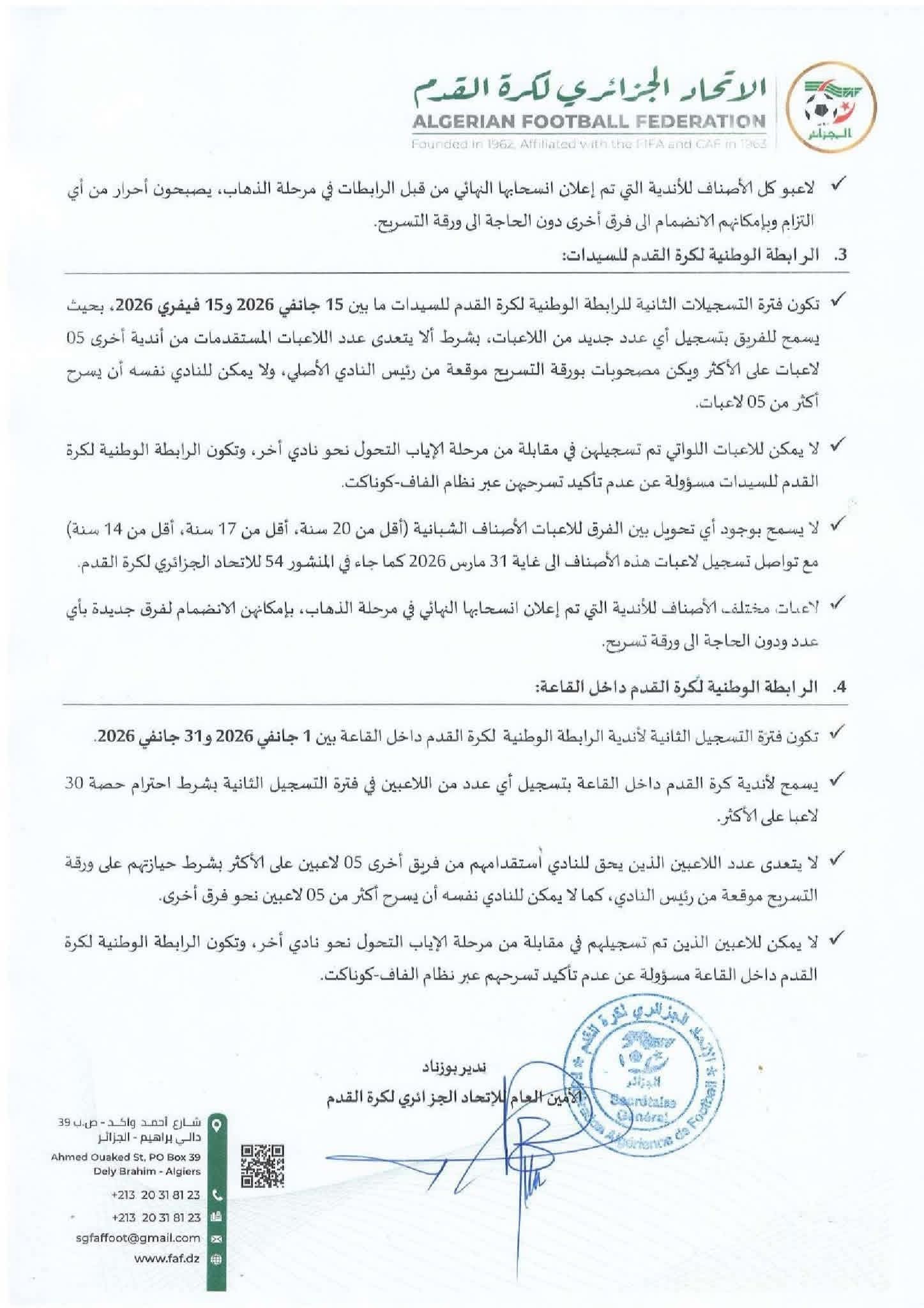 2026 تاريخ الميركاتو يكون من تاريخ 05 جانفي 2026 الى غاية 05 فيفري