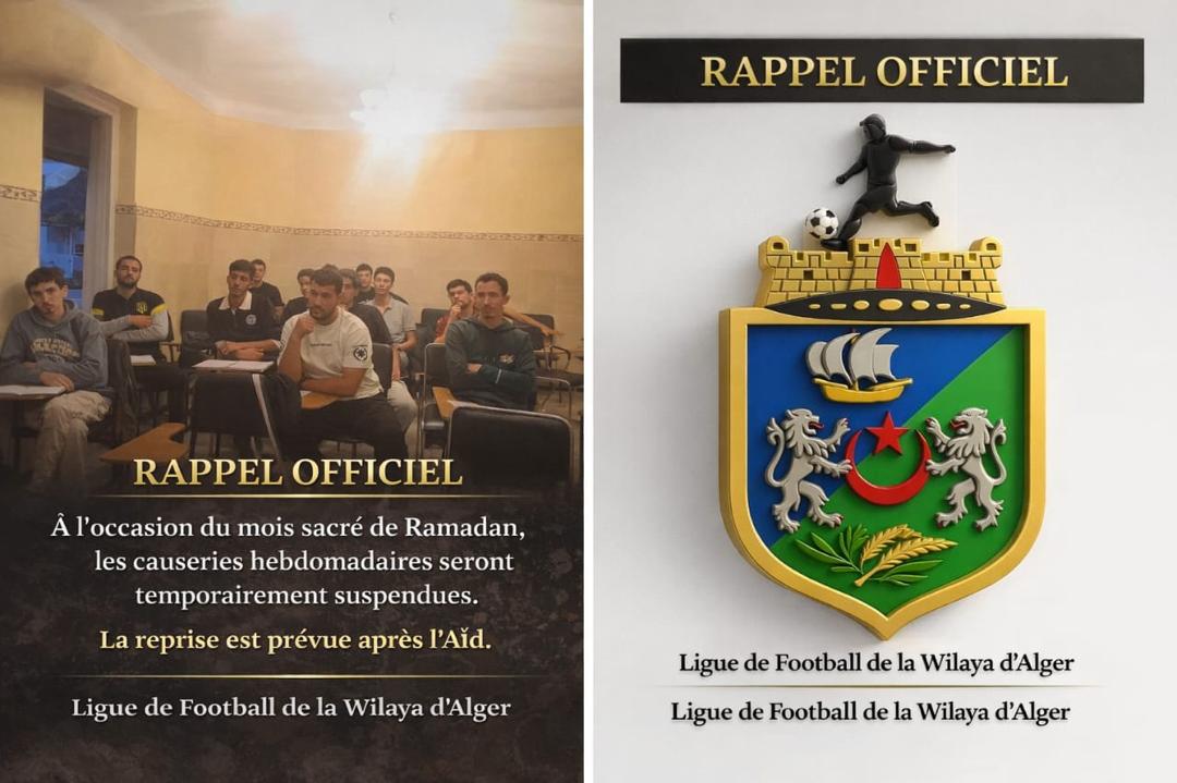 بمناسبة حلول شهر رمضان المبارك، تعلم رابطة كرة القدم لولاية الجزائر أن الحصص التكوينية الأسبوعية ستُعلَّق مؤقتًا طوال الشهر الفضيل، على أن يُستأنف النشاط مباشرة بعد عيد الفطر.